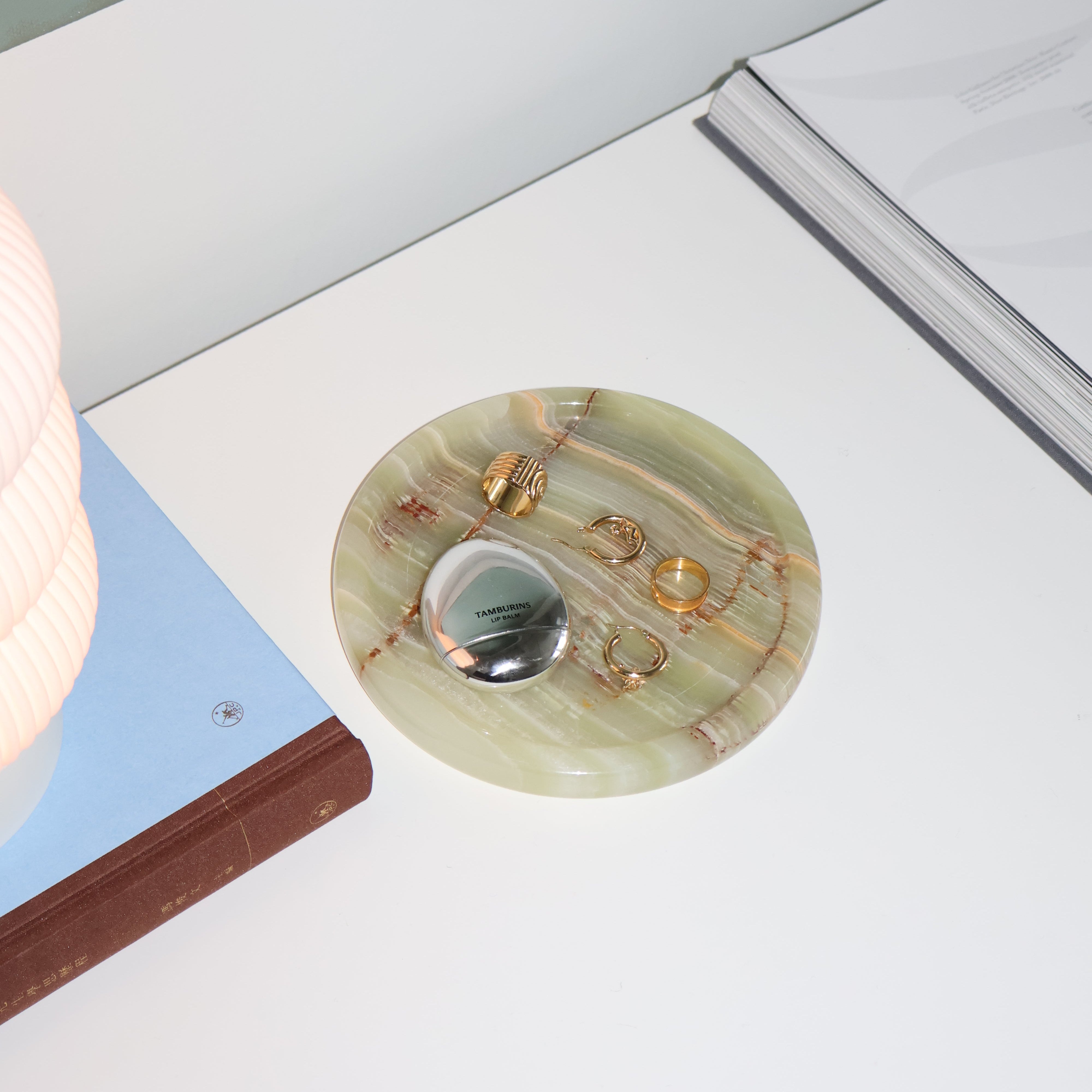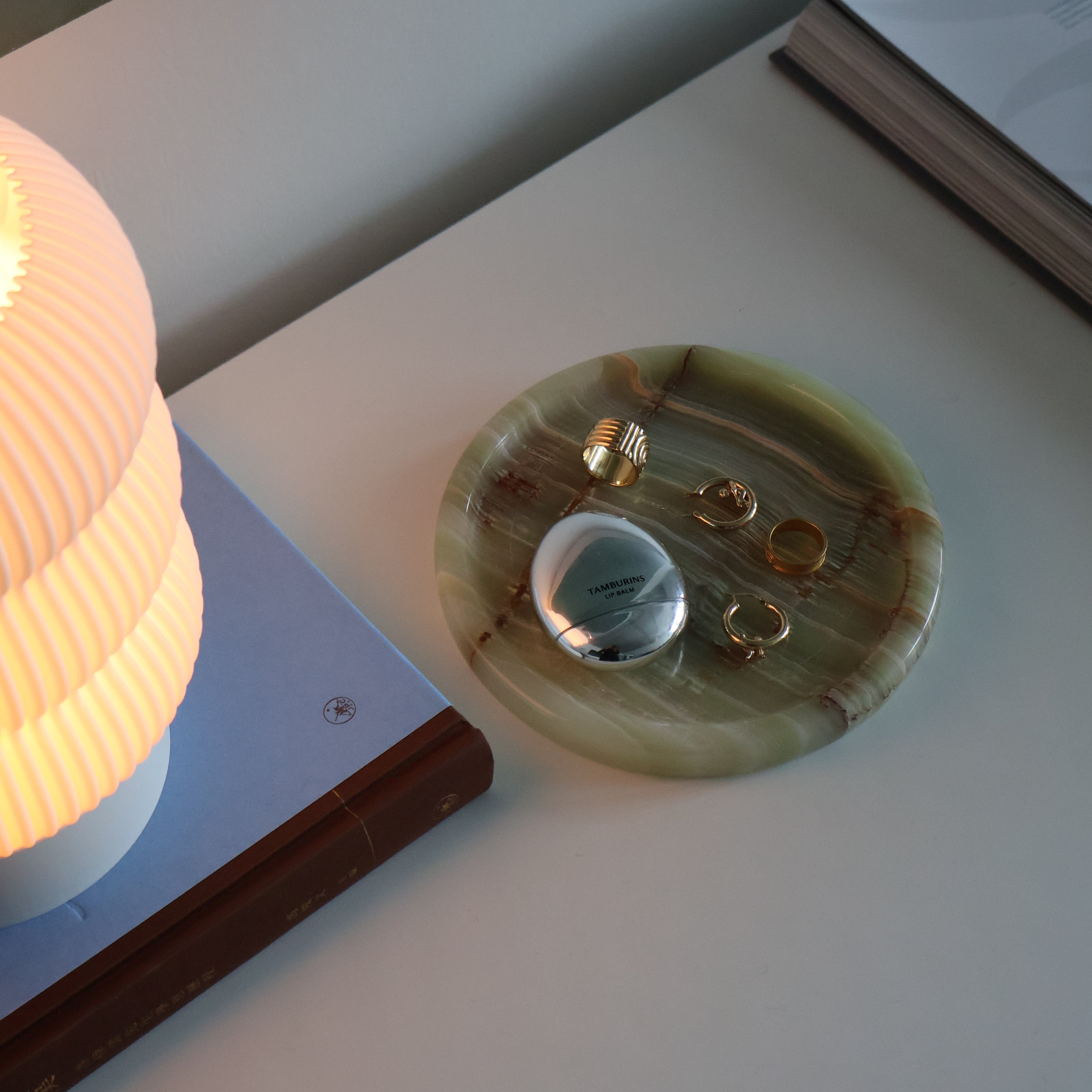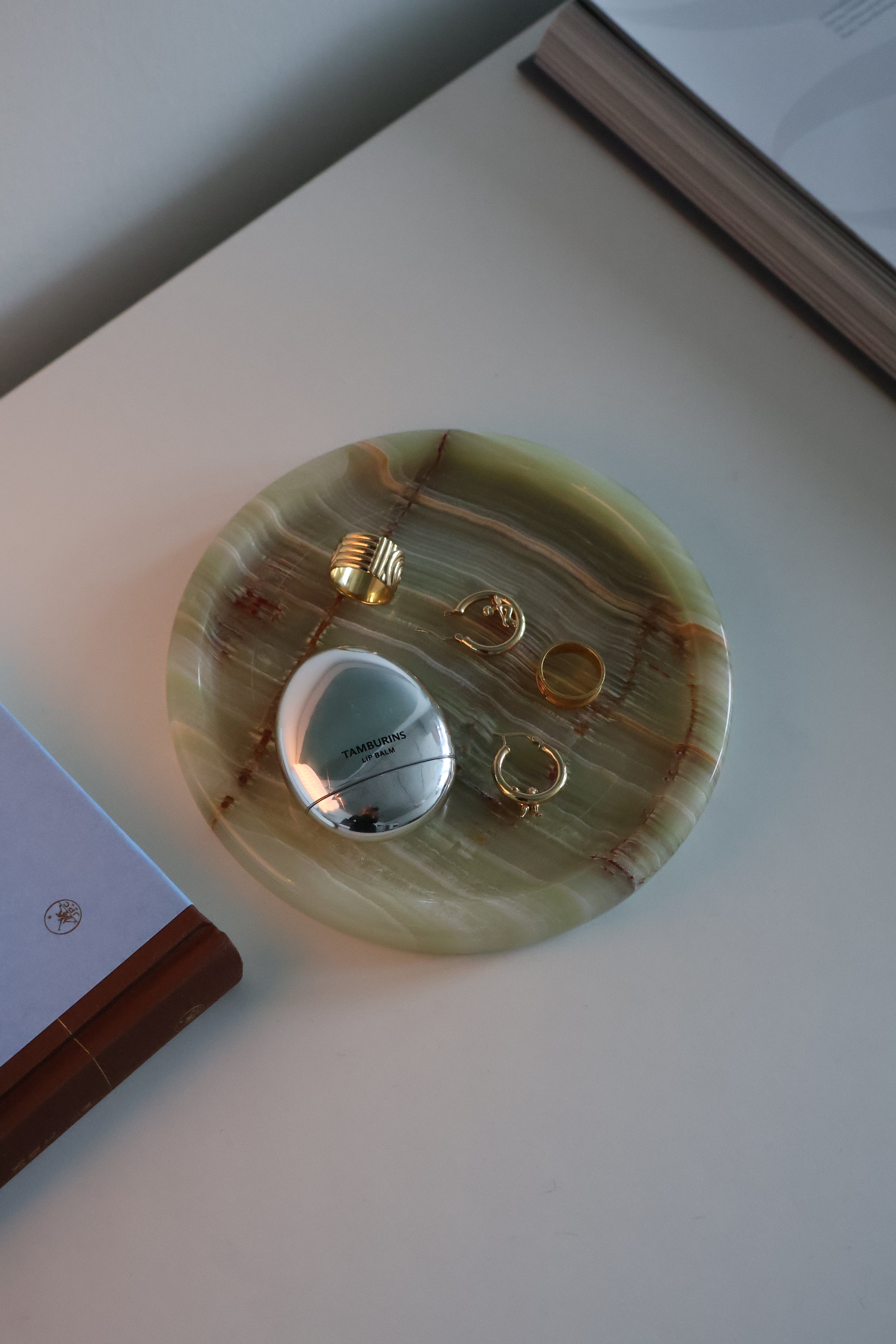 sourced from a vintage market on huaihai road, the sinan onyx tray is carved from natural stone with soft green tones and warm, reddish veining. its smooth, rounded form adds an understated elegance to any surface - perfect for jewelry, keys, or incense. the color variation in the onyx is completely unique, making this a one-of-one vintage piece.