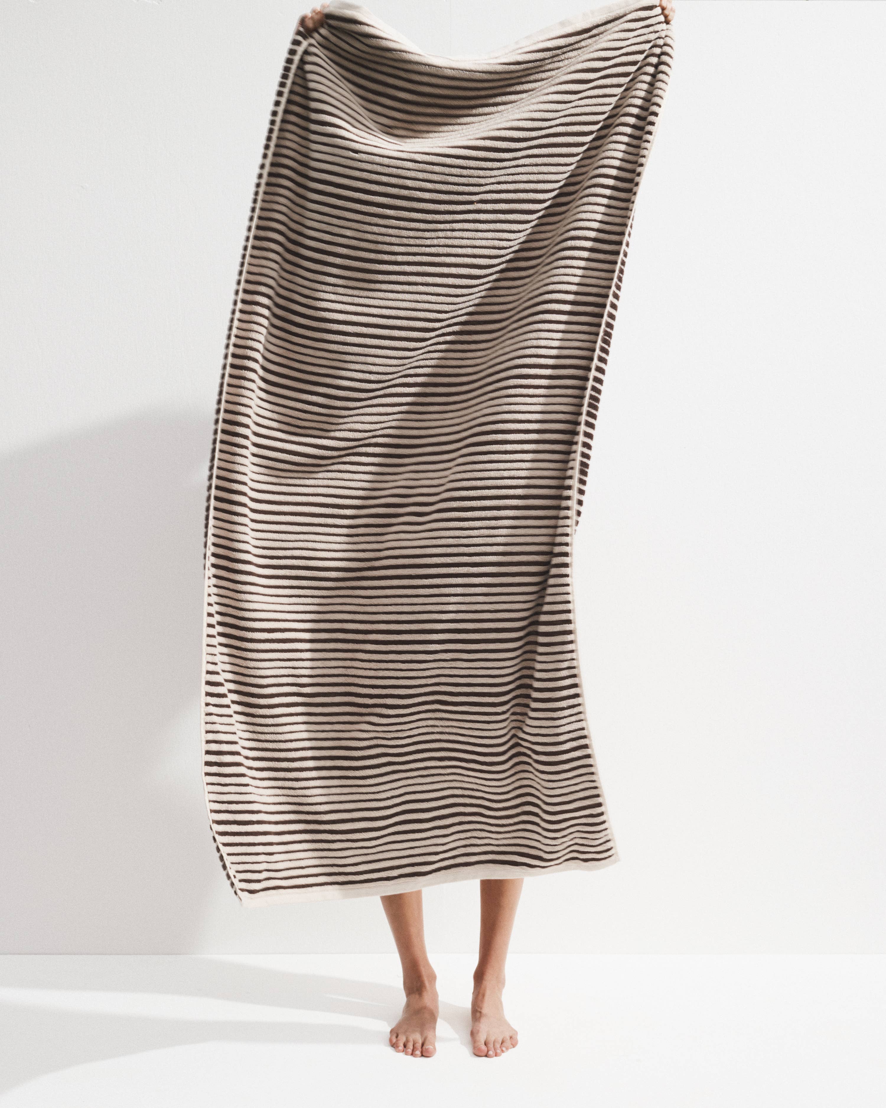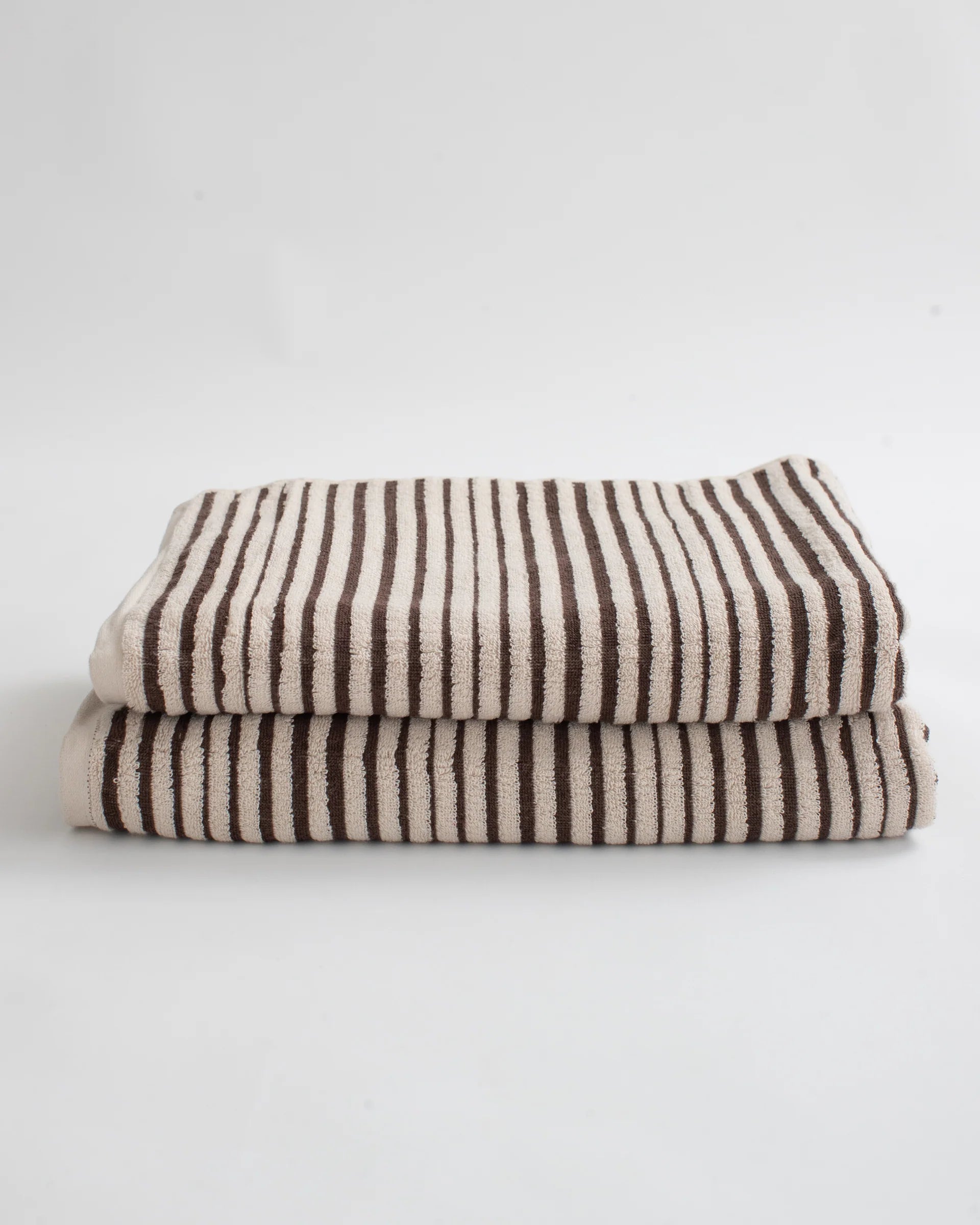 embrace mediterranean elegance with the salento bath sheet in affogato. its organic, slightly irregular stripe pattern in rich dark chocolate brown brings warmth and sophistication to your bath or beach routine. designed for versatility, it’s perfect for lounging by the pool or wrapping up after a refreshing shower.